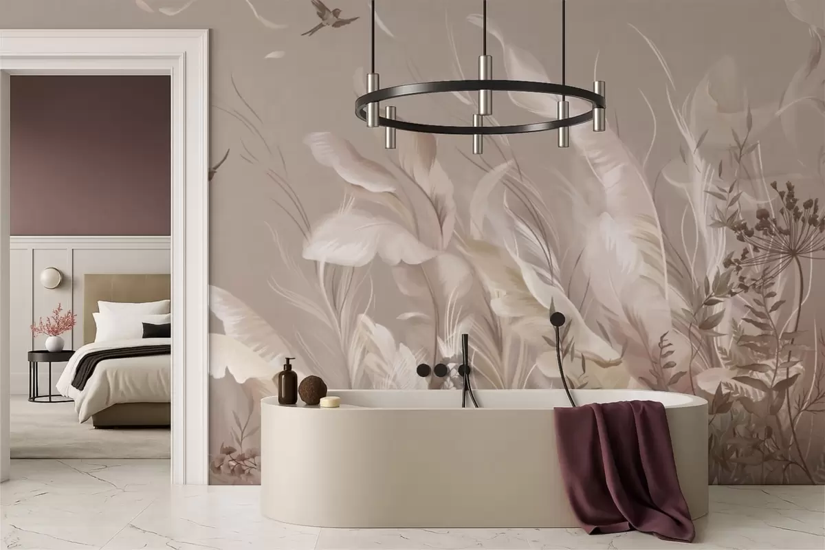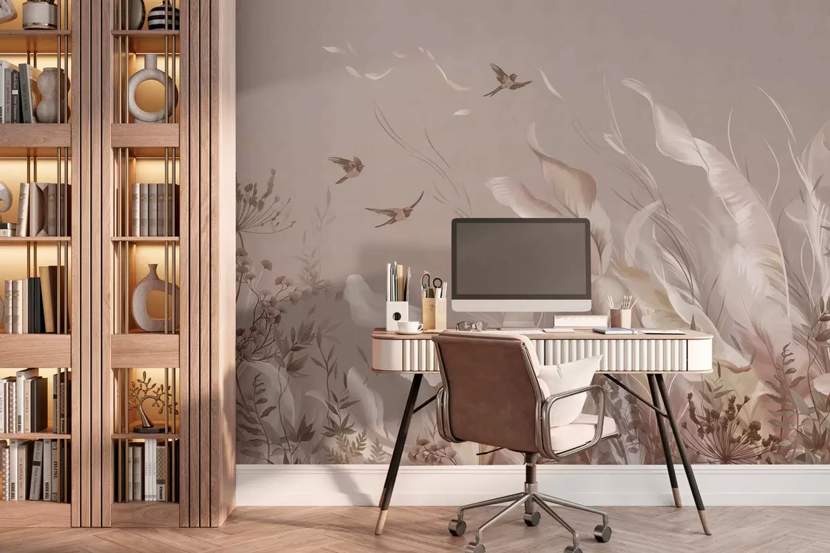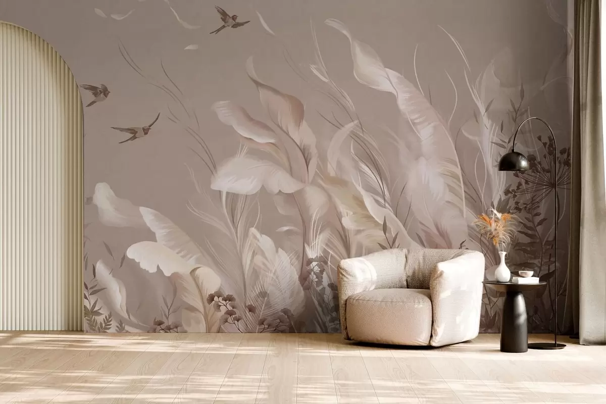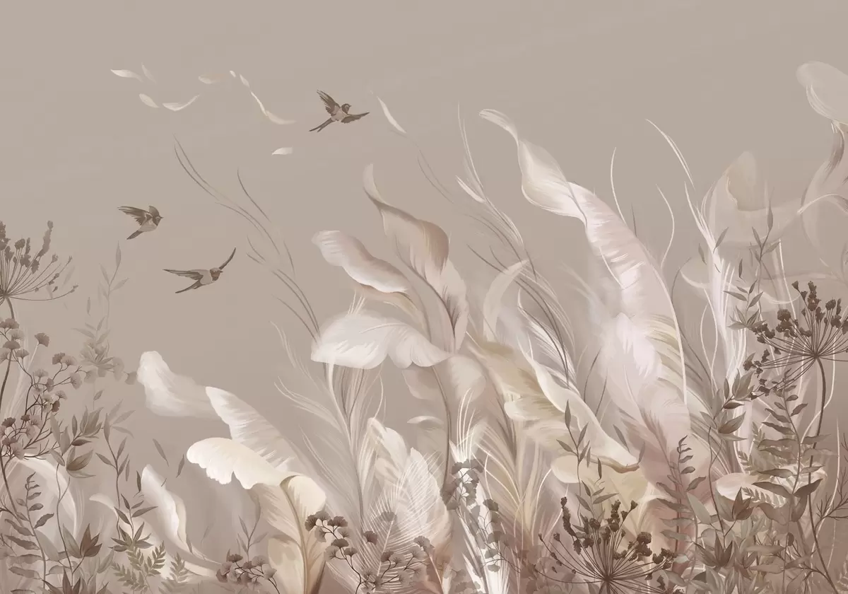 Wall murals Light feathers and plants with birds in pastel tones Nr. w05395v1