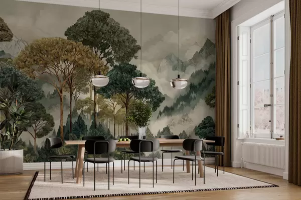 Wall murals Forest with tall trees in misty mountains Nr. w05410
