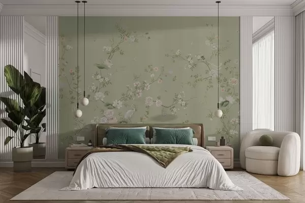 Wall murals Flowering branches with birds on light green Nr. w05416