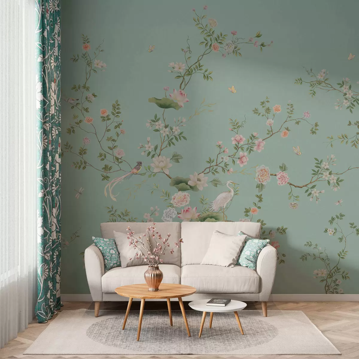 Wall murals Flowering branches with birds on blue background Nr. w05416v1
