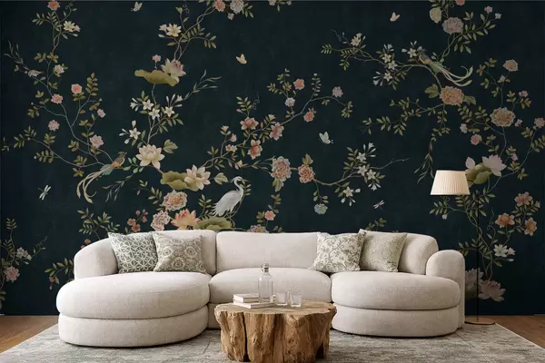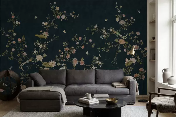 Wall murals Flowering branches with birds on dark background Nr. w05416v3
