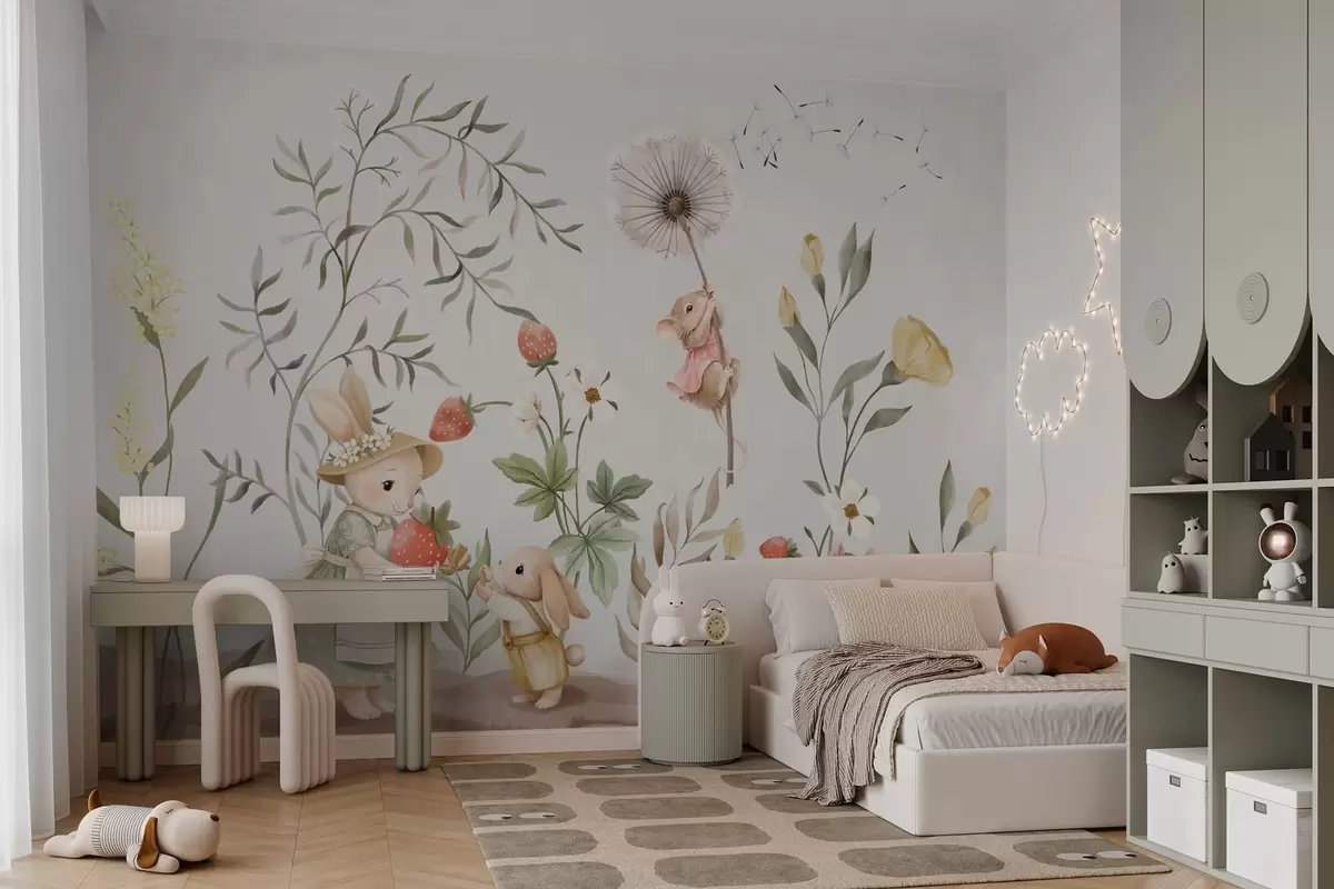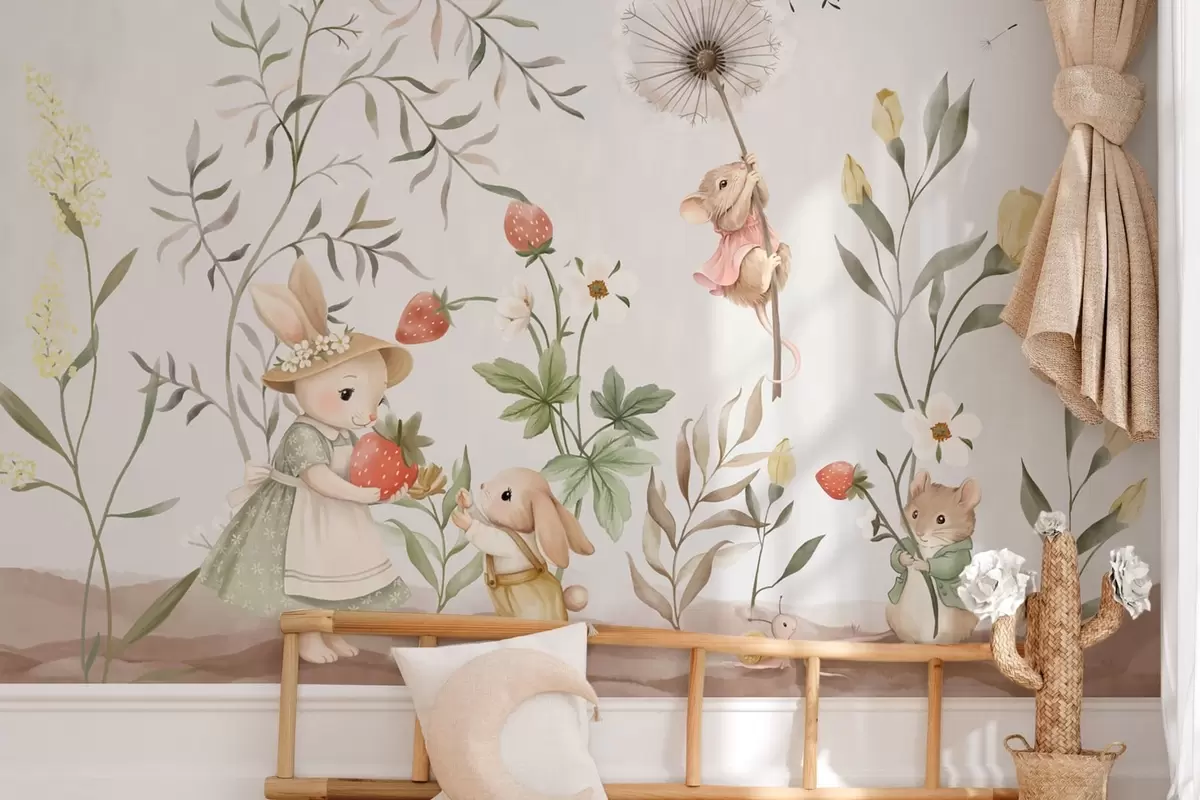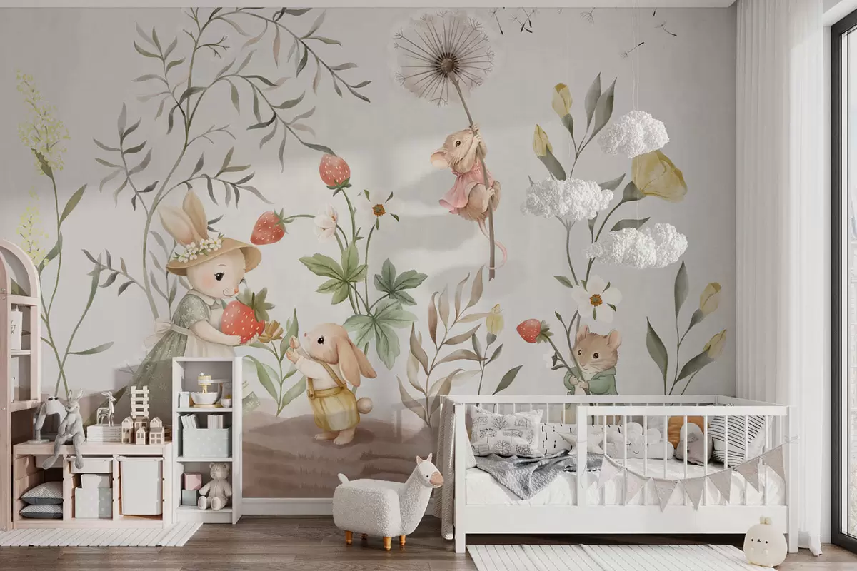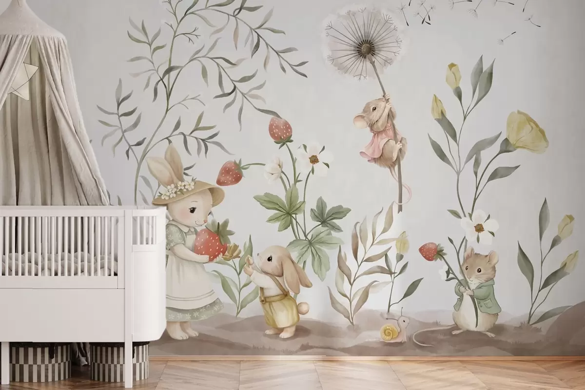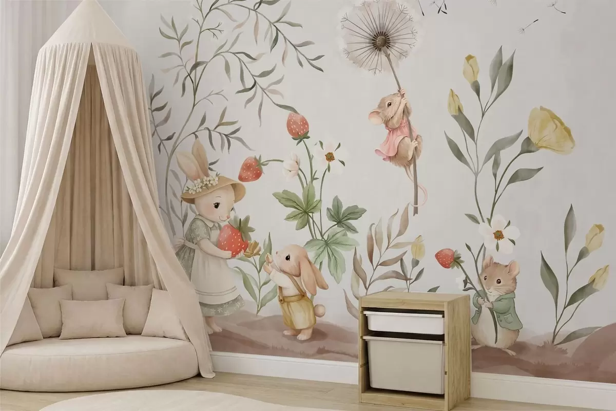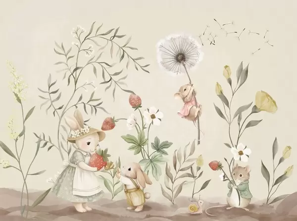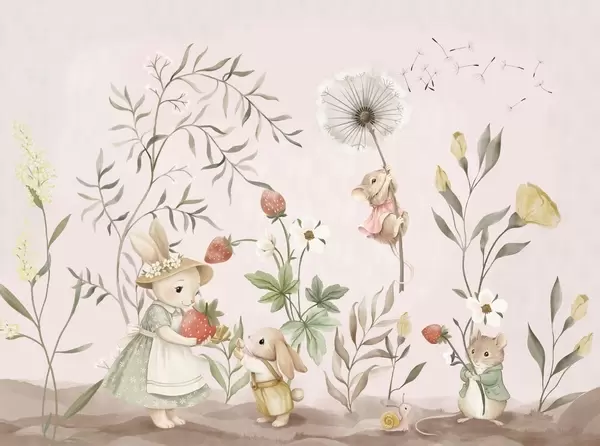 Wall murals Children illustration of bunny, mouse among plants and flowers Nr. w05422