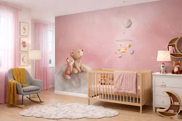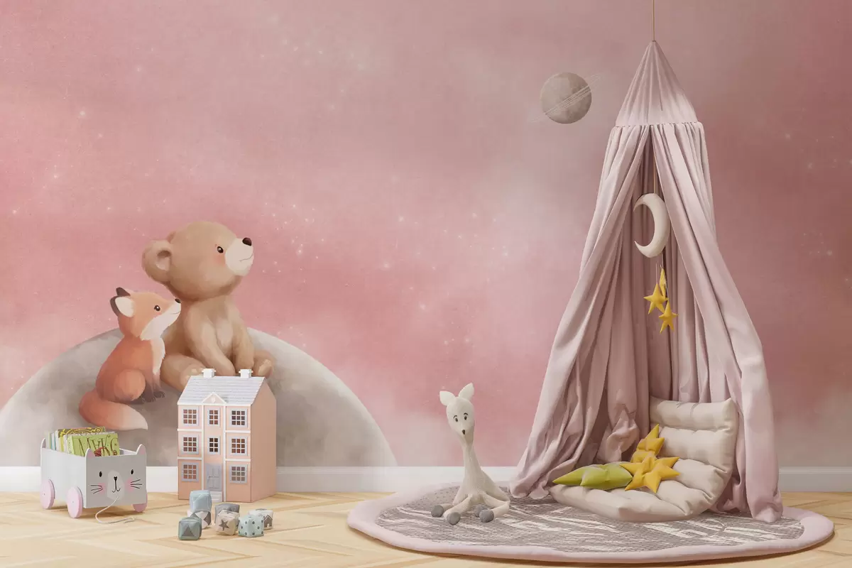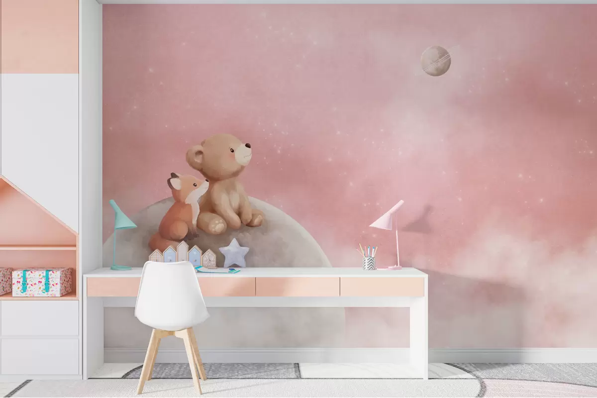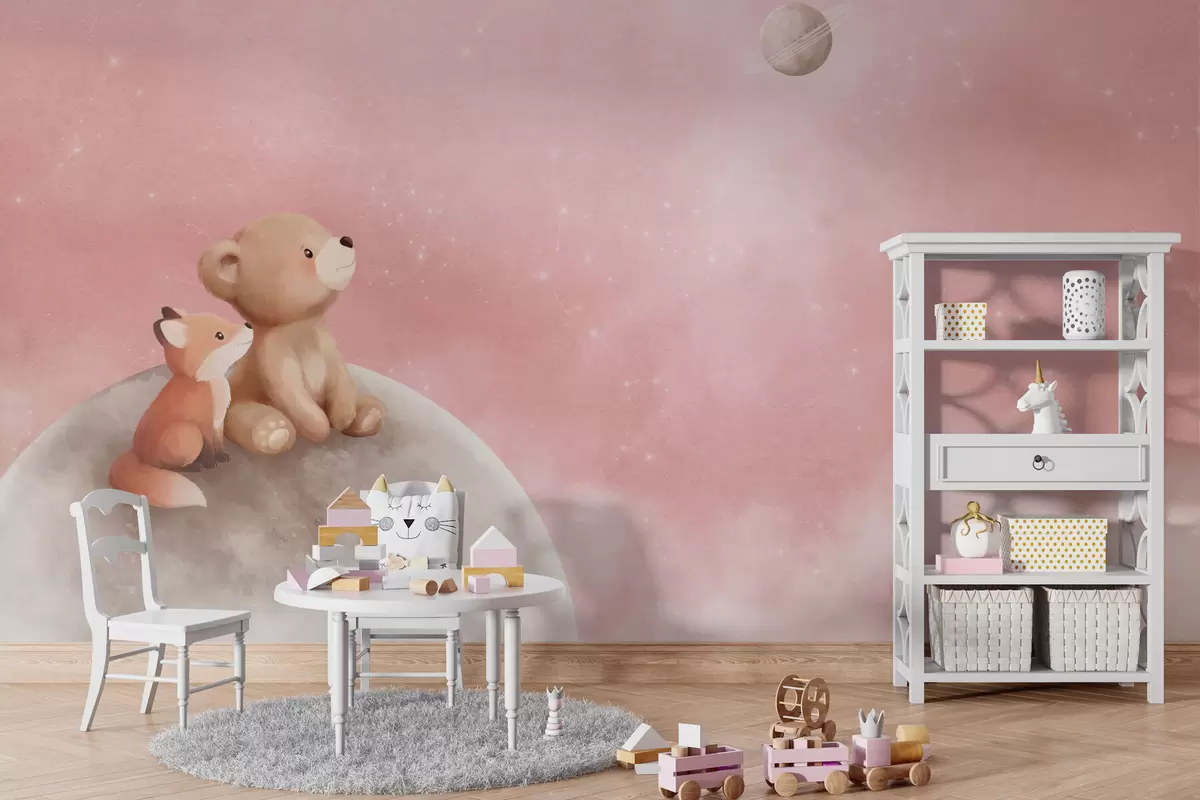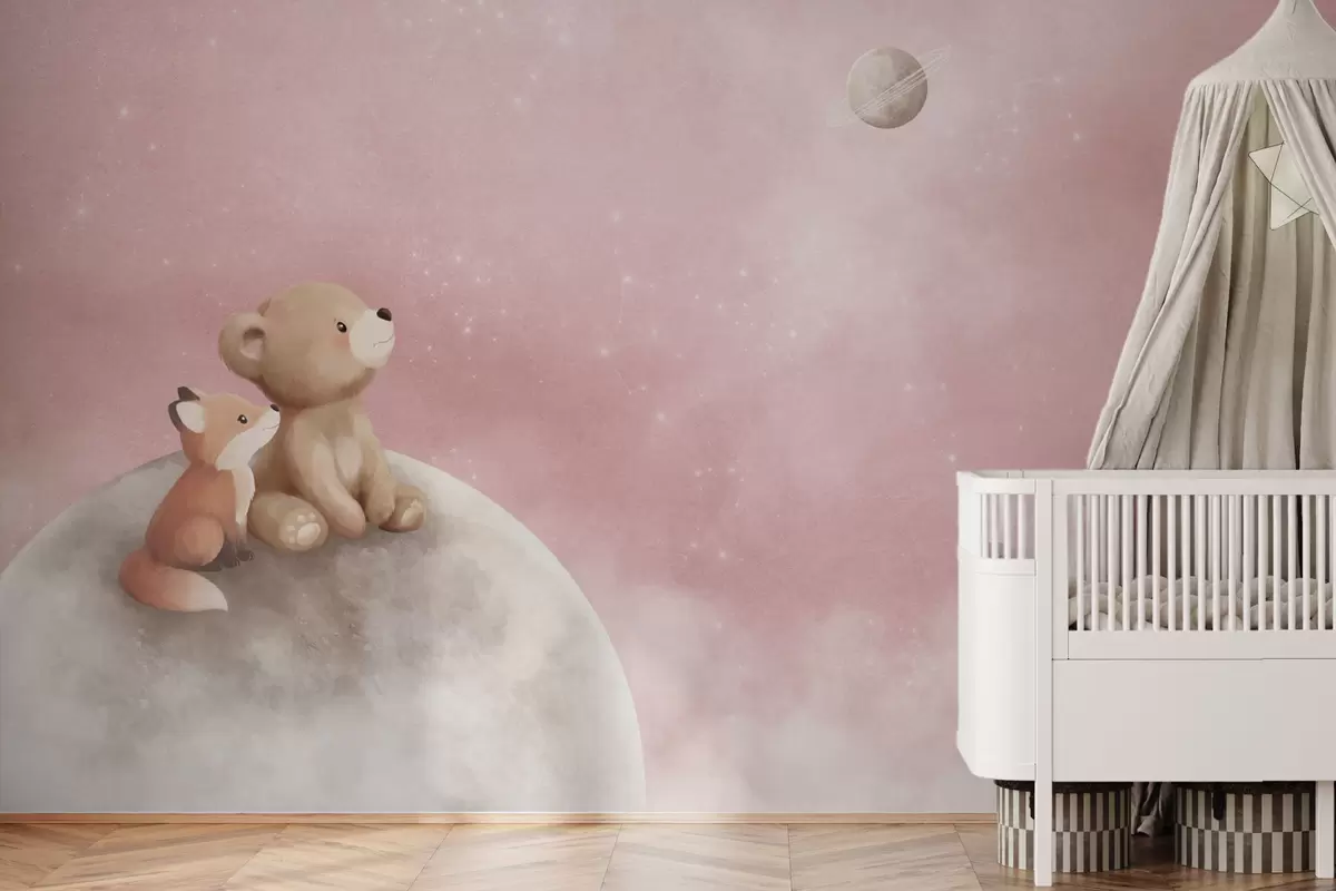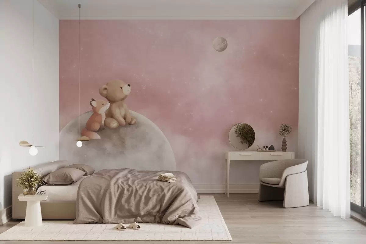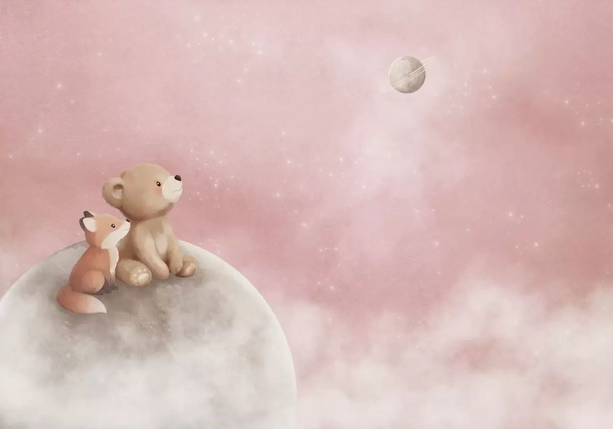 Wall murals Pastel illustration bear and fox on moon pink sky Nr. w05431v2