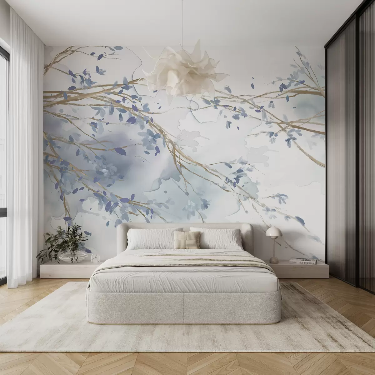 The interior transformation after adorning the living room with delicate blue and white floral branches is striking. The soft watercolor background introduces a calming atmosphere, enhancing the natural light that fills the space. The graceful floral design adds an elegant touch, making the room feel more inviting and serene. This mural creates a harmonious blend of flora and fauna elements, promoting a sense of tranquility and connectedness with nature, perfect for relaxation and contemplation.