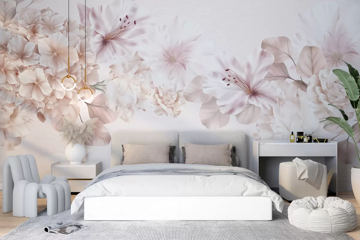 The introduction of the soft pink and white floral mural transforms the living room into a serene oasis. The delicate petals and blossoms create a calming ambiance, enhancing the space with a gentle touch of nature. This pastel design fosters a sense of tranquility, making the room feel more inviting and spacious. The light background complements the overall decor, harmonizing beautifully with beige furnishings. The mural not only adds visual interest but also evokes a refreshing and uplifting atmosphere, perfect for relaxation and social gatherings.