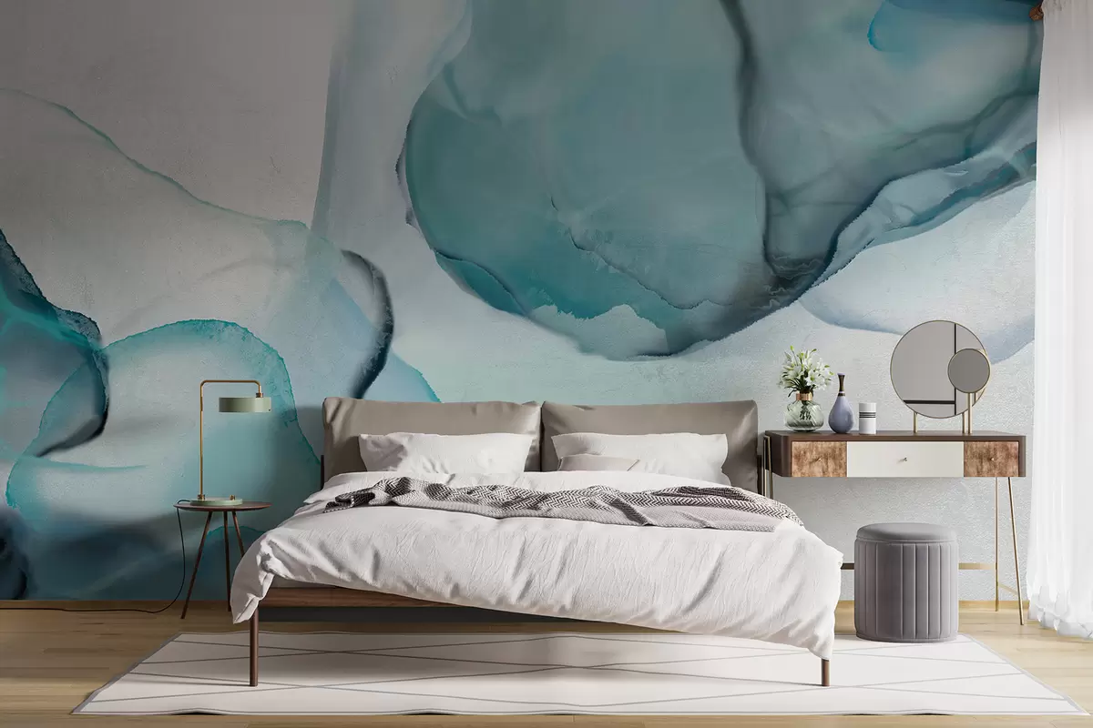 Introducing the wall mural featuring abstract blue and white fluid art transforms the living room into a serene retreat. The watercolor hues of turquoise create a calming atmosphere, evoking the gentle flow of water. The marbling design adds depth and interest, making the space visually stunning without overwhelming it. This artwork fosters a sense of tranquility and creativity, seamlessly blending with various decor styles. The overall effect is refreshing, inviting a feeling of spaciousness and relaxation into the living area.