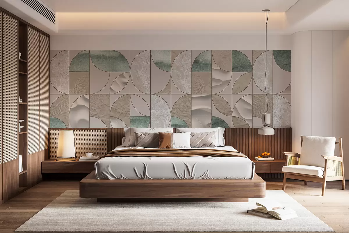 The addition of the geometric wall mural transforms the living room into a contemporary oasis. The interplay of green, beige, and white textures creates a calming atmosphere, enhancing the room's natural light. The 3D geometric shapes add depth and visual interest, while the circular patterns introduce a sense of flow and harmony. This design not only makes the space feel more inviting but also encourages a relaxed ambiance, perfect for gatherings or quiet moments. The overall effect is one of sophistication and tranquility, redefining the living area.