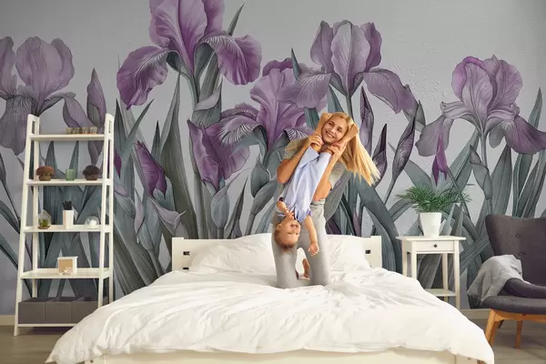 Transforming your living room with large painted pink irises creates an inviting atmosphere that exudes tranquility and elegance. The mauve tones of the irises contrast beautifully against the white concrete wall, adding a fresh, organic touch. This floral mural not only enhances the visual appeal but also encourages a sense of calm and serenity, making the space feel warm and welcoming. The interplay of flora and fauna brings a lively yet soothing ambiance, perfect for relaxation or entertaining guests.