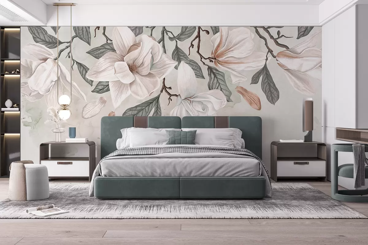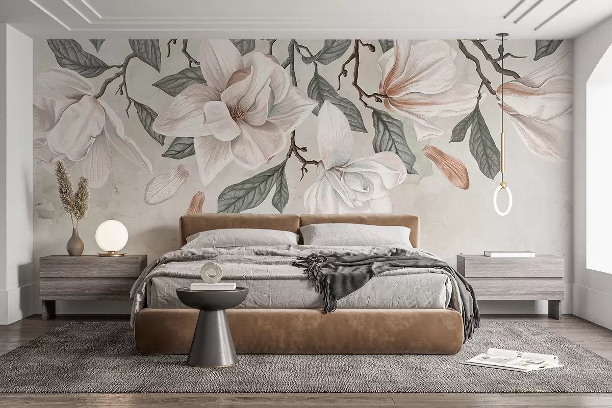 Transforming the living room with delicate pink and white magnolia wall murals creates a serene and inviting atmosphere. The soft floral composition adds a touch of elegance while the green leaves bring a refreshing natural element into the space. The light background enhances the overall brightness, making the room feel more expansive and airy. This beautiful mural not only serves as a focal point but also harmonizes with the furniture and decor, promoting a sense of tranquility and connection to nature, enriching the overall aesthetic of the interior.