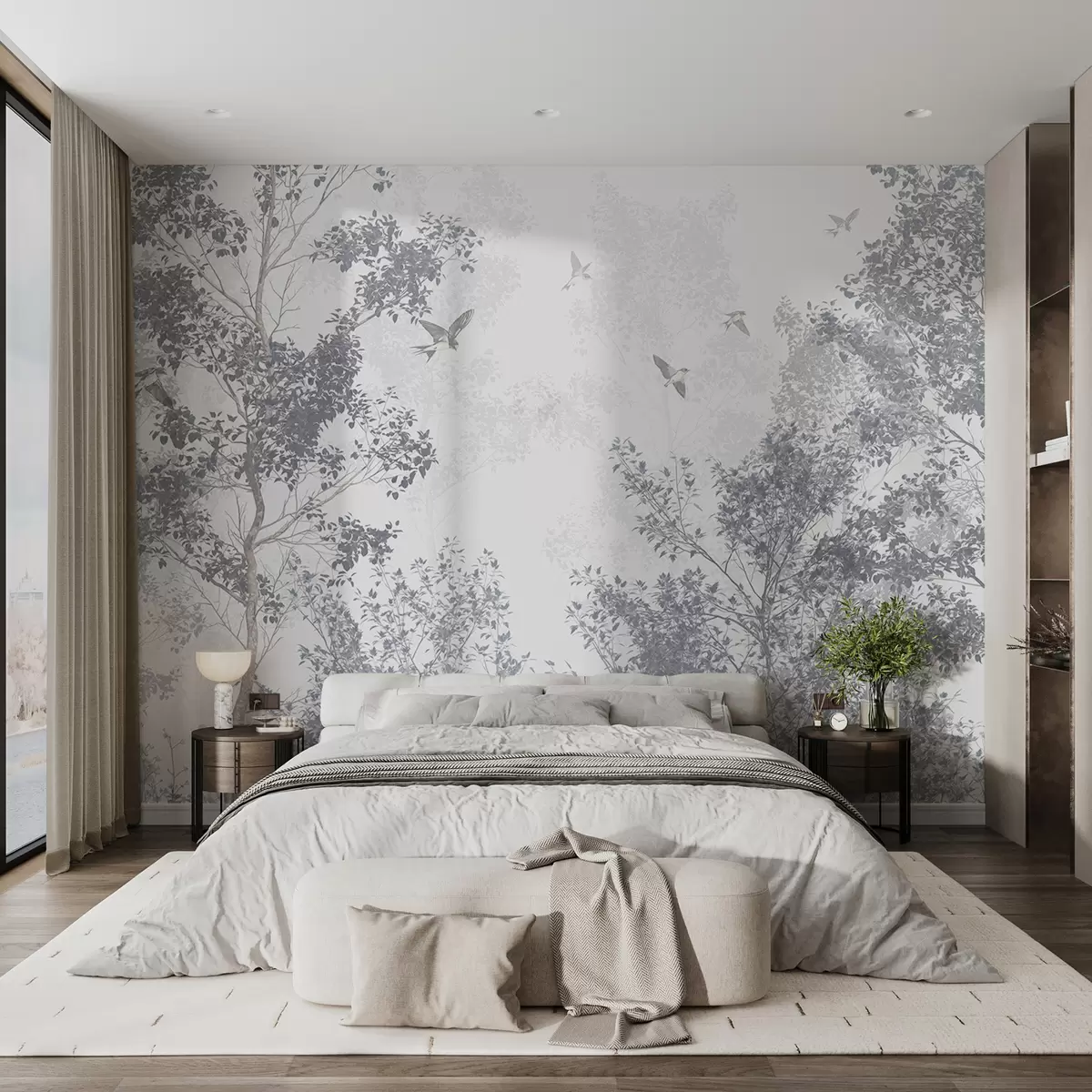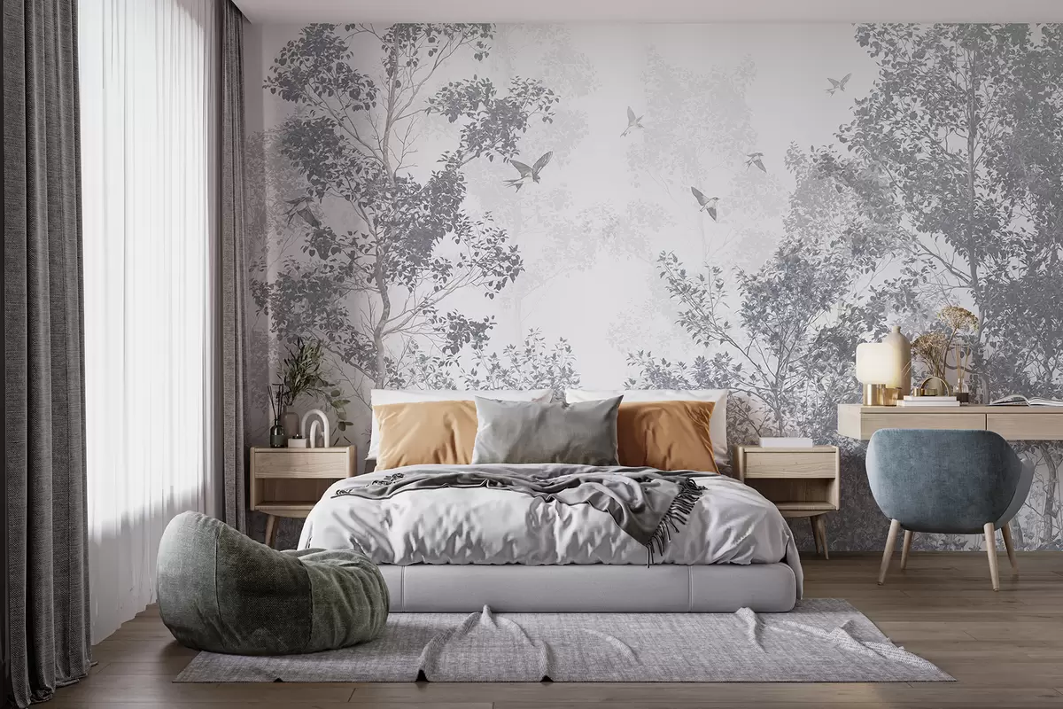 The Bare soft print of blue trees with branches against a hazy, overcast sky transforms the living room into a serene retreat. This mural creates a soothing backdrop, inviting a sense of calm and tranquility. The subtle hues harmonize with natural elements, enhancing the atmosphere with an enchanted forest feel. The flying birds add a dynamic touch, engaging the imagination while maintaining a peaceful ambiance. The overall effect is a refreshing, nature-inspired space that promotes relaxation and contemplation in neutral light.
