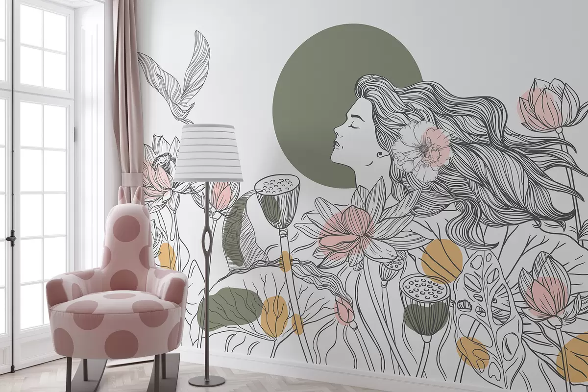 Transforming your living room with the wall mural featuring a woman in nature, floral motifs, and softly colored elements breathes new life into the space. The delicate line drawing of lotus flowers and lush leaves creates a serene ambiance, inviting peace and tranquility. The pastel colors harmoniously blend with your decor, fostering a calming atmosphere. Flying birds enhance the sense of freedom and connection to nature, making it an inspiring focal point that encourages relaxation and promotes a nature-inspired aesthetic throughout the room.
