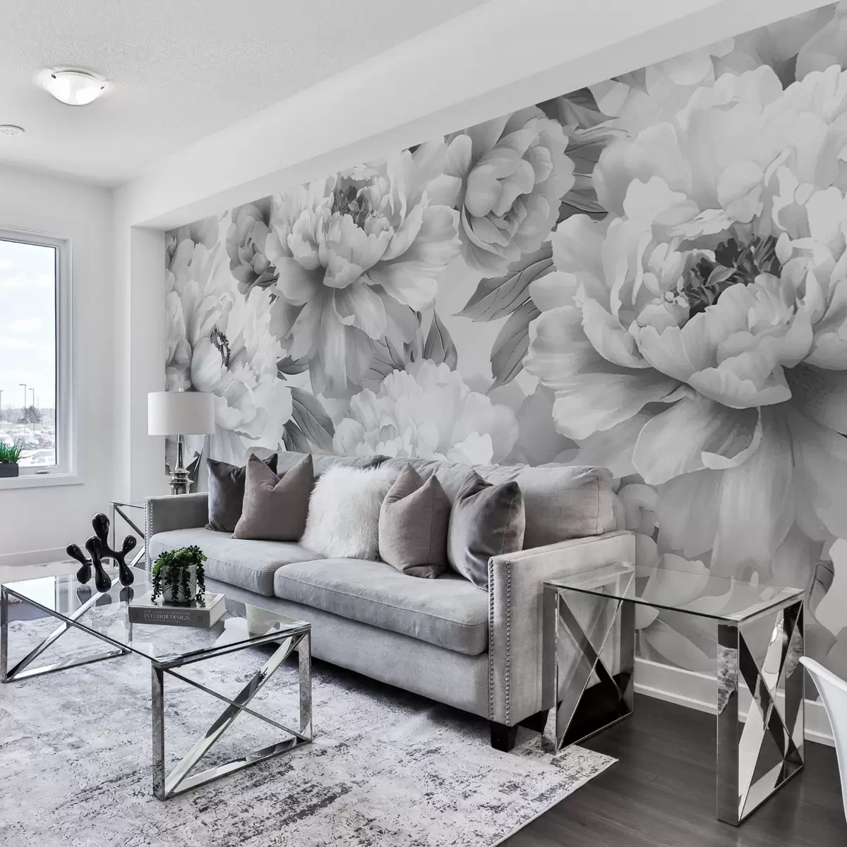 Transforming your living room with the Wall Mural of black and white peonies brings a serene elegance to the space. The intricate floral design adds depth while maintaining a calm and sophisticated ambiance. The neutral light beautifully complements the mural, creating a harmonious balance with off-white décor elements. This refreshing backdrop not only enhances the aesthetic but also fosters a tranquil environment, making the living room feel more inviting and stylish.