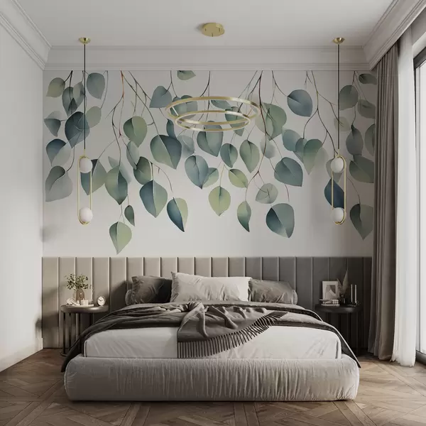 The addition of the Wall mural featuring branches with eucalyptus leaves transforms the living room into a serene retreat. The neutral light enhances the soothing color palette, creating a calming atmosphere. The 3D leaves draw the eye and add depth, making the space feel more dynamic and alive. Botanical art brings a touch of nature indoors, fostering tranquility and a connection to the outdoors. Overall, the mural elevates the room's aesthetic, promoting relaxation and a refreshing ambiance.
