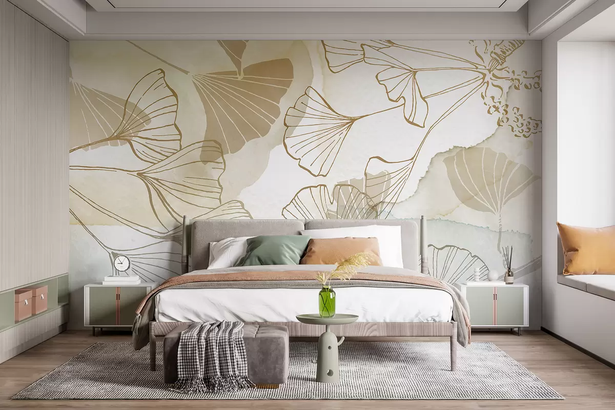 The interior of the living room transformed beautifully with the addition of delicate ginkgo leaf wall murals. The soft shades of beige, tan, and blue create a calming atmosphere, enhancing the space's tranquility. The intricate line art of the leaves adds sophistication, making the walls feel alive and connected to nature. The light background illuminates the room, ensuring it feels airy and spacious. This design introduces a refreshing elegance, harmonizing with various decor styles while inviting warmth and comfort.