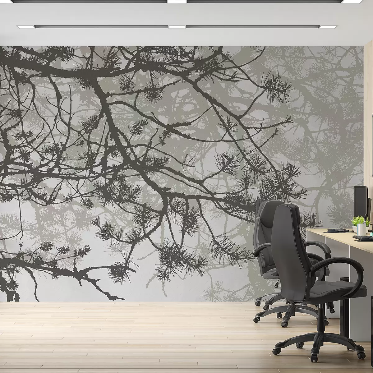 The addition of wall murals featuring branches of a large tree in gray tones creates an inviting and tranquil atmosphere in the living room. The neutral light softens the space, enhancing the mural's intricate details while bringing a touch of nature indoors. This design choice promotes a calming ambiance, making the room feel more spacious and harmonized. The subtle interplay of shadows adds depth, connecting the interior to the serenity of a forest retreat, ultimately fostering a sense of peace and relaxation for anyone who enters.