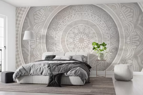 Wall murals A detailed symmetrical gray and white mandala print with concentric circles and geometric shapes Nr. w08182