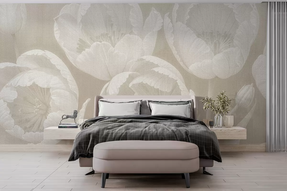 Transforming your living room with the wall mural of white tulips against a soft, pink blurred background adds a serene touch to the space. The minimalist design enhances the room's elegance, making it feel more open and inviting. The gentle hues create a calming atmosphere, perfect for relaxation. This artwork serves as a beautiful focal point, effortlessly blending modern aesthetics with organic beauty, while the subtle depth of the flowers adds a sense of dimension and tranquility to your home.