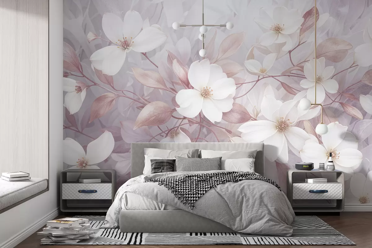 Transforming your living room with the delicate pink and white magnolia flower mural brings a serene elegance to the space. The soft, blurred branches create a calming atmosphere, enhancing natural light and making the room feel more spacious. This floral design introduces a refreshing touch of nature, inviting warmth and tranquility. The subtle color palette harmonizes beautifully with various decor styles, making it the perfect backdrop for cozy gatherings or quiet relaxation. Overall, it rejuvenates the room, fostering a peaceful, inviting environment.