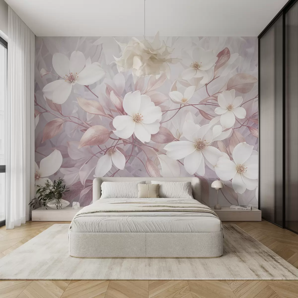Transforming your living room with the delicate pink and white magnolia flower mural brings a serene elegance to the space. The soft, blurred branches create a calming atmosphere, enhancing natural light and making the room feel more spacious. This floral design introduces a refreshing touch of nature, inviting warmth and tranquility. The subtle color palette harmonizes beautifully with various decor styles, making it the perfect backdrop for cozy gatherings or quiet relaxation. Overall, it rejuvenates the room, fostering a peaceful, inviting environment.