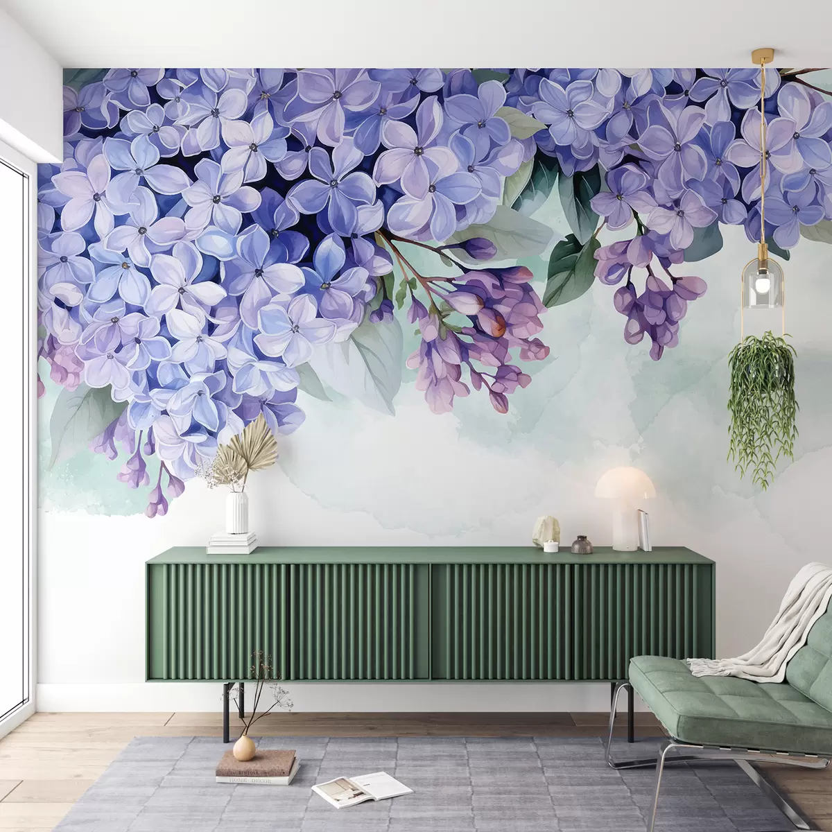 Transforming the living room with vibrant purple hydrangea wall murals creates an inviting atmosphere that exudes tranquility and warmth. The rich hues of the flowers beautifully contrast with the soft, blurred background, enhancing the room's depth and visual interest. This artistic touch infuses the space with a sense of nature, bringing life and energy into the environment. The overall effect is a harmonious blend of color and imagery, making the living area not only more aesthetically pleasing but also a comforting retreat.