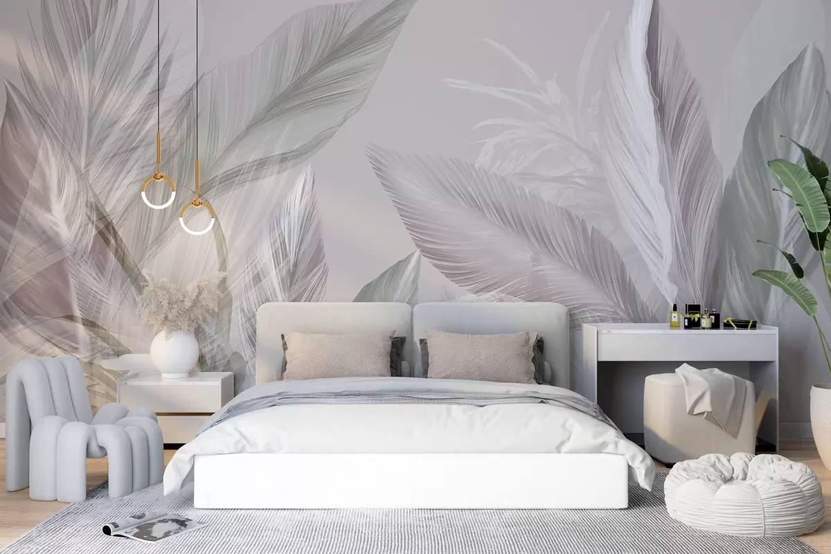 The addition of wall murals featuring soft white, pink, and gray feathers alongside tropical leaves dramatically transforms the living room. The pastel colors create a serene atmosphere, enhancing the overall brightness and neutral light in the space. The gentle patterns evoke a sense of calmness and tranquility, making the room feel more inviting and spacious. This elegant backdrop harmonizes beautifully with furniture and decor, infusing a touch of nature and softness, perfect for relaxation and social gatherings.
