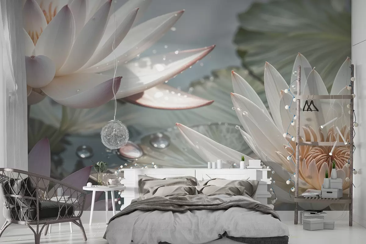 The interior of the living room transforms into a serene oasis with the addition of wall murals featuring white lotus flowers adorned with water droplets. This artwork creates a calming atmosphere, inviting a sense of tranquility and peace. The subtle hues blend harmoniously with the neutral light, enhancing the space’s warmth. The blurred green background adds depth, ensuring the room feels spacious and inviting. Overall, the mural fosters a connection with nature, uplifting the ambiance and promoting relaxation.