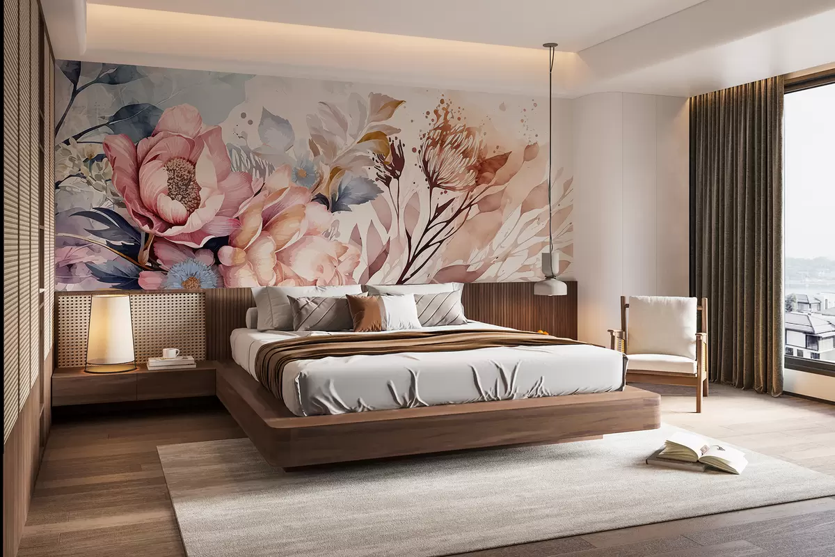 Transforming your living room with large pink and blue flower wall murals creates a serene and inviting atmosphere. The delicate petals, complemented by smaller blooms against a soft watercolor background, introduce a sense of tranquility and elegance. This floral arrangement enhances the spatial depth and warmth of the space, making it feel more alive and connected to nature. The pastel hues provide a soothing color palette, enriching the overall aesthetic while stimulating a calming environment, perfect for relaxation and social gatherings.