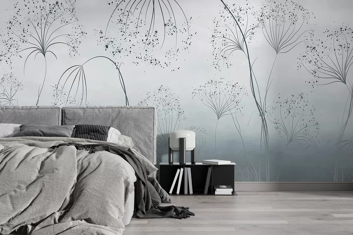 Wall murals Blue tall, wispy plants with delicate, umbrella-shaped flowers or seed heads in a misty, atmospheric environment Nr. w08258v1