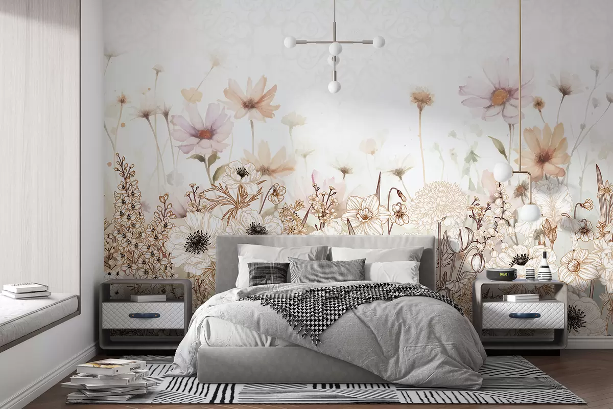 Transforming your living room with the wall mural featuring a field of white, beige, and pink flowers creates an inviting atmosphere. The gentle floral backdrop brings a sense of serenity and warmth, promoting a calming environment. The soft hues interact beautifully with neutral light, enhancing the space’s brightness and openness. This botanical art not only adds depth but also fosters a connection with nature, making the room feel more vibrant and alive with the essence of wildflowers.