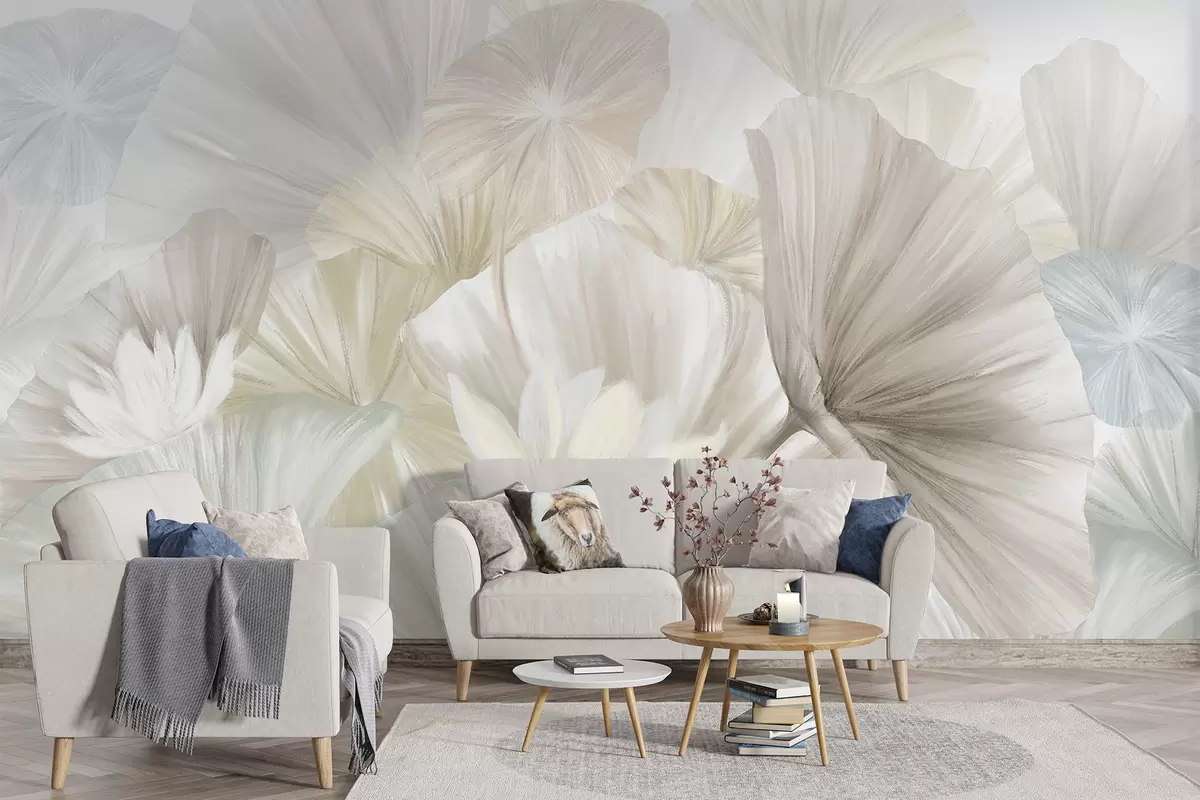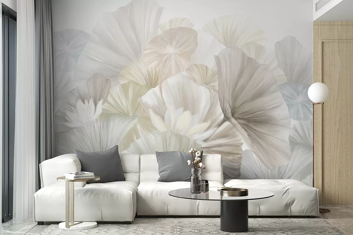 The installation of the delicate green lotus leaves and white flowers mural transforms the living room into a serene oasis. The soft, feathery petals create an inviting atmosphere, fostering tranquility and relaxation. The natural art composition gently complements the neutral light, enhancing the overall brightness of the space. The pastel hues impart a soothing vibe, making the room feel spacious and airy, while simultaneously connecting to themes of flora and fauna, bringing a touch of nature indoors.