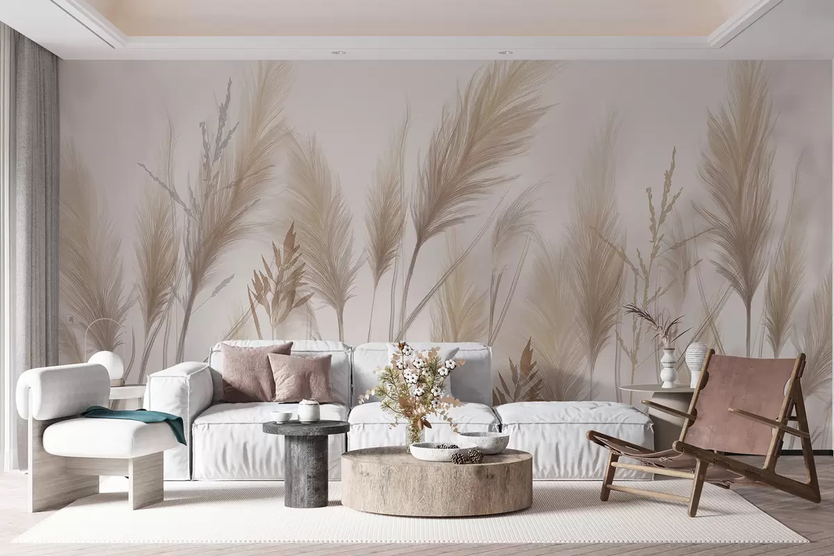 Transforming your living room with the wall mural featuring tall beige grass blades swaying in the wind brings a sense of tranquility and natural beauty. The soft, light background creates an airy atmosphere, enhancing the space's openness and warmth. This design palette embraces the calming influence of nature and fosters a relaxed ambiance, making the room feel more inviting. The gentle movement depicted in the mural adds a dynamic element, encouraging a peaceful flow throughout your home, harmonizing with various decor styles effortlessly.