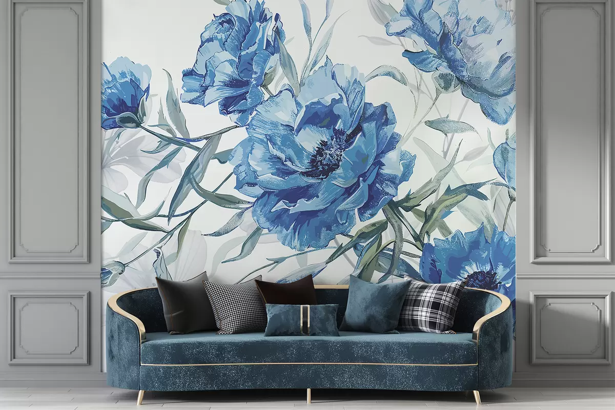 Transforming your living room with the blue peonies mural introduces a serene and inviting atmosphere. The lush foliage and delicate watercolor elements create a refreshing backdrop that promotes tranquility. The vibrant blue flowers are visually captivating, drawing the eye and enhancing the space with a touch of elegance. Against the light abstract background, the mural brings depth and sophistication, making the room feel brighter and more open. This design not only uplifts the aesthetic but also evokes a sense of nature's beauty indoors, enriching your living environment.