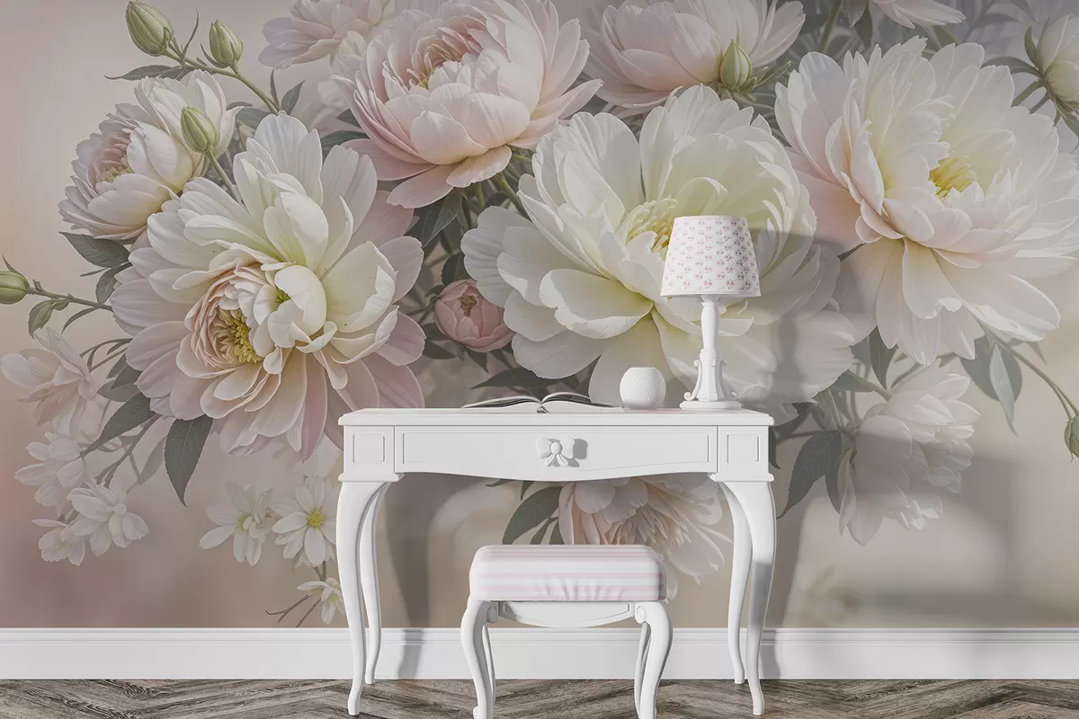 Wall murals A bouquet of lush, pastel-colored peonies and other flowers against a soft, blurred background Nr. w08276