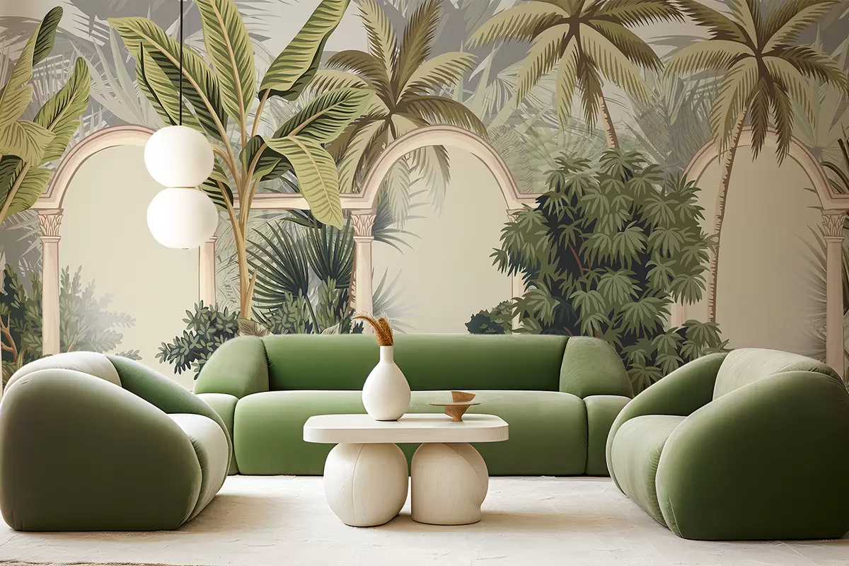 Transforming your living room with the Wall Mural featuring arches and a tropical landscape introduces a refreshing atmosphere. The lush palm trees and vibrant foliage against a neutral light backdrop create an inviting and tranquil space. This mural enhances natural light, making the room feel more open and connected to nature. The window view becomes more dynamic, inviting a sense of calm and relaxation, perfect for unwinding or entertaining guests. Overall, it elevates the aesthetic and mood of your living area.