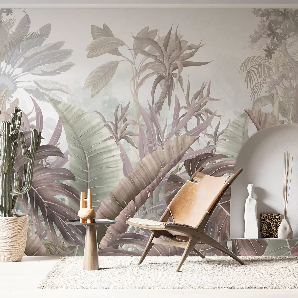Transforming your living room with a tropical jungle mural featuring large palm leaves and exotic plants in muted shades of gray, white, and beige creates a serene and inviting atmosphere. The botanical art adds depth and character, making the space feel more expansive and connected to nature. The calming color palette harmonizes with various interior styles, while the imagery evokes a sense of tranquility and relaxation. This stunning backdrop not only enhances the aesthetic appeal but also inspires a peaceful ambiance centered around tropical themes and natural beauty.