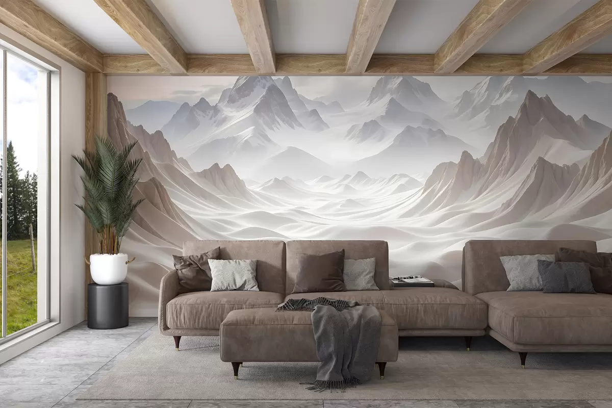 The addition of the wall mural featuring snowy mountain peaks transforms the living room into a serene oasis. The soft, neutral light enhances the ethereal landscape, creating a calming atmosphere. Rolling hills and valleys invite a sense of depth and tranquility, making the space feel open and expansive. This panoramic view not only serves as a striking focal point but also encourages relaxation and contemplation, seamlessly blending nature's beauty with interior design. The overall effect is a harmonious, inviting environment.
