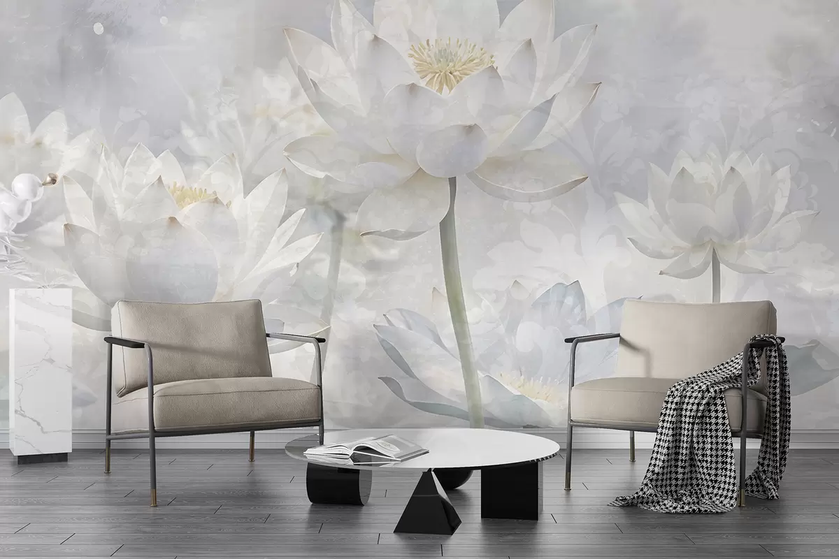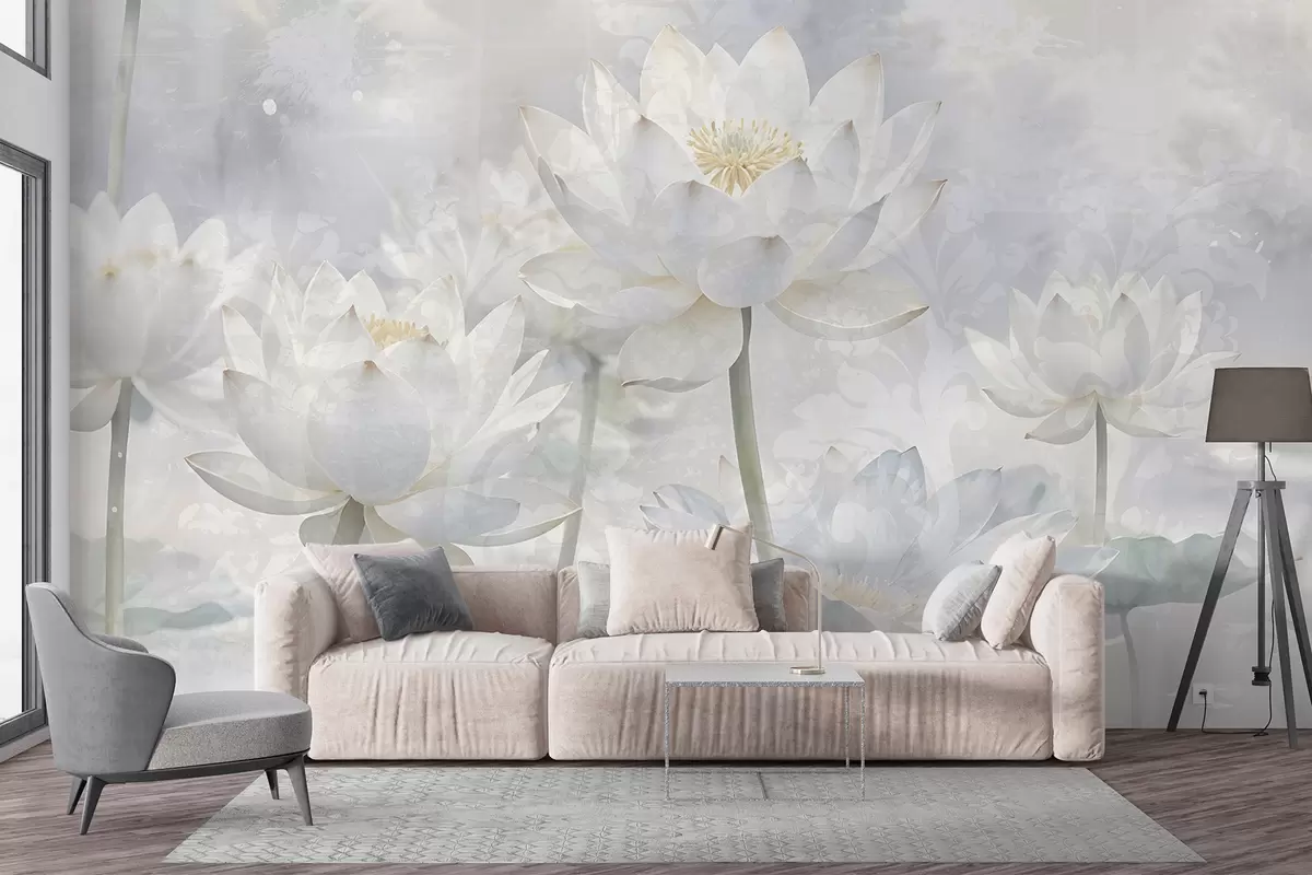 Adding the wall mural of white lotus flowers in a misty, ethereal pastel landscape transforms the living room into a serene oasis. The delicate floral design enhances the space with a calming ambiance, while the soft pastels invite a feeling of tranquility. Neutral light reflects beautifully off the mural, making the room feel brighter and more spacious. This enchanting backdrop seamlessly connects with nature, creating a harmonious environment that encourages relaxation and appreciation of flora and fauna.