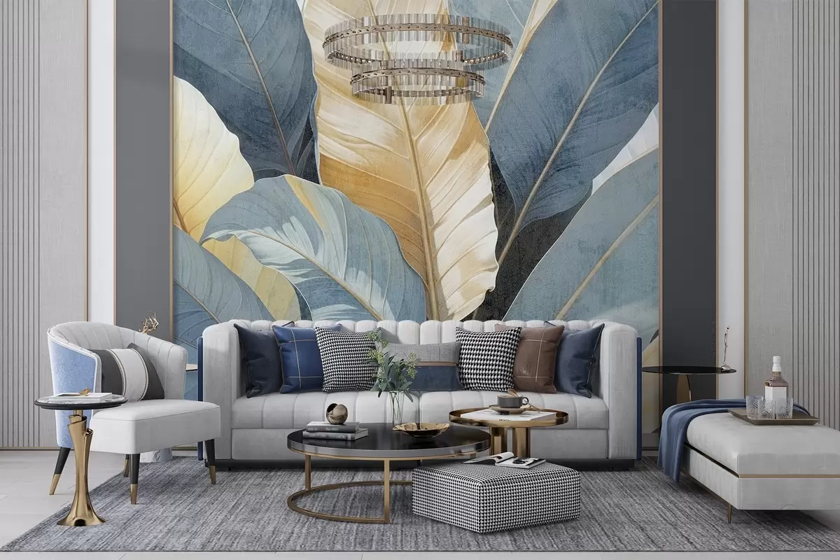 Transforming your living room with a mural featuring lush tropical leaves in vibrant shades of blue, green, and yellow creates a refreshing ambiance that breathes life into the space. The intricate textures of the leaves evoke a sense of tranquility, blending seamlessly with neutral light to enhance the room's openness. This design brings the essence of nature indoors, promoting relaxation and inspiring a deeper connection with flora and fauna, while the presence of Alocasia can add a unique tropical flair to your decor.