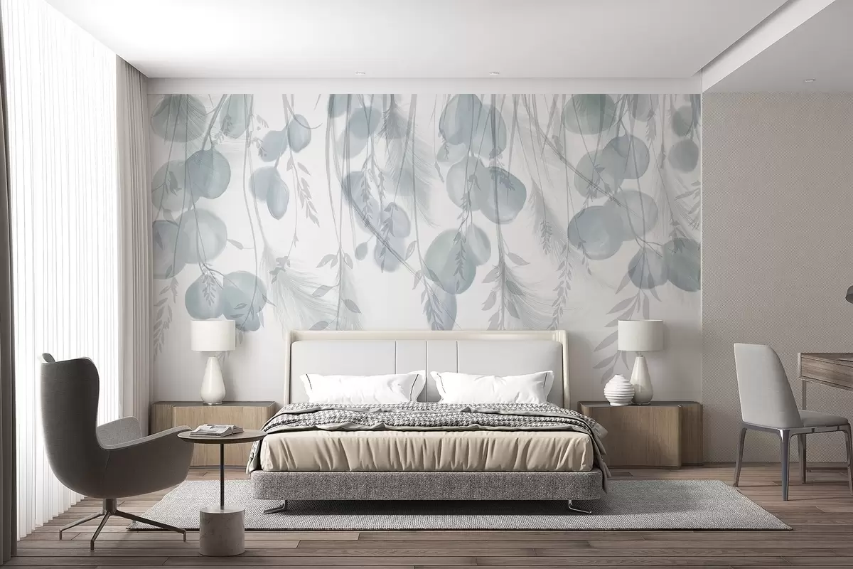 The application of the delicate gray and pastel green eucalyptus leaves mural transforms the living room into a sanctuary of tranquility. The subtle hues create an airy, peaceful ambiance, inviting relaxation and calmness. The watercolor effect adds a soft touch, while the falling leaves evoke a sense of nature inside, enhancing the space's overall aesthetic. This mural harmonizes beautifully with your decor, encouraging a serene atmosphere perfect for unwinding or entertaining. Flora and fauna elements seamlessly blend to enrich the living experience.