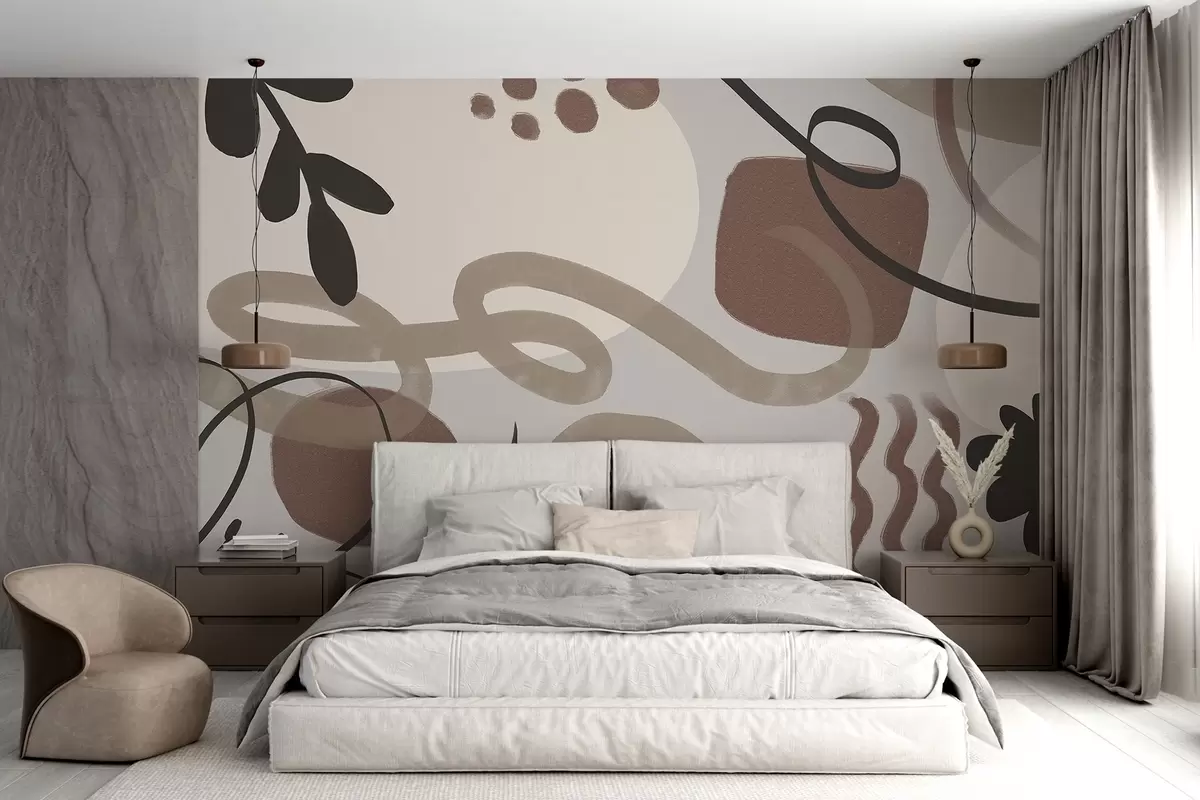 The addition of the abstract textured mural creates a serene atmosphere, enhancing the living room's modern aesthetic. The earthy tones of brown, beige, and black introduce warmth and depth, transforming the space into a calming retreat. The minimalistic design complements existing decor while adding a touch of sophistication. Soft, neutral light reflects off the mural's surfaces, illuminating the room with a gentle glow. This botanical art brings a sense of nature indoors, creating an inviting and harmonious environment perfect for relaxation and social gatherings.
