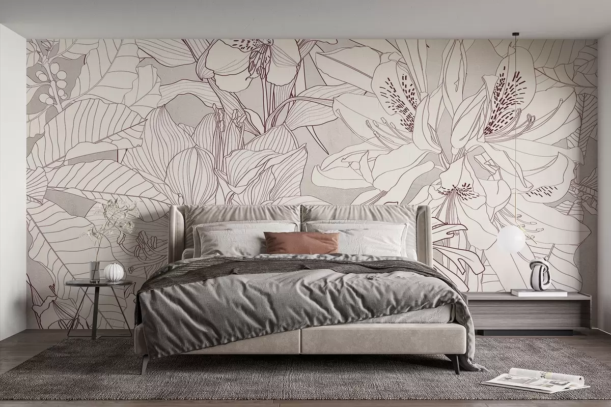 The introduction of a detailed bordo and gray floral print mural transforms the living room into a serene botanical retreat. The intricate design of various flowers and leaves adds depth and character, fostering a calming yet vibrant ambiance. The neutral light plays beautifully against the pastel elements, enhancing the mural's delicacy. This lush backdrop not only creates visual interest but also promotes a sense of tranquility and connection to nature, making the space feel more welcoming and alive.