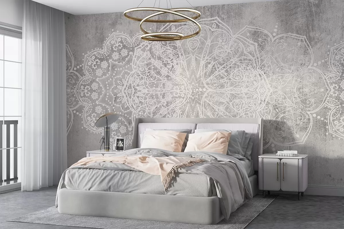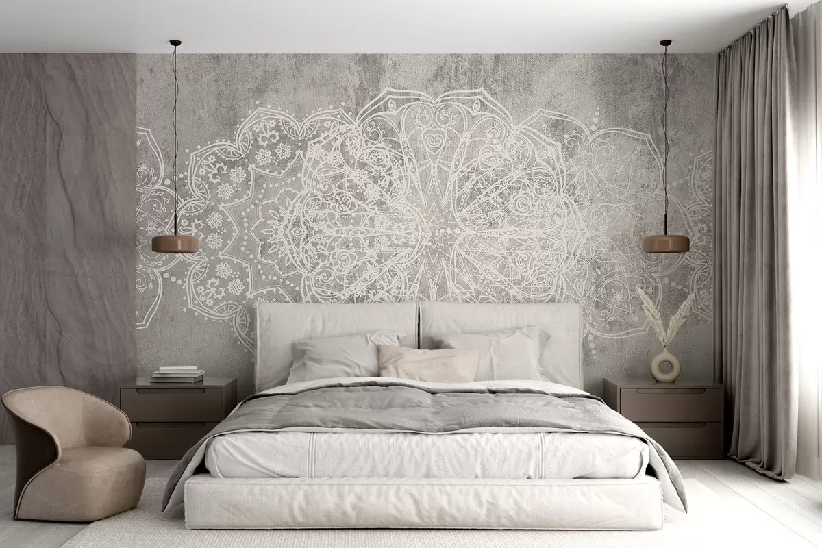 Wall murals A detailed, intricate white lace mandala pattern on a textured loft gray wall background Nr. w08387