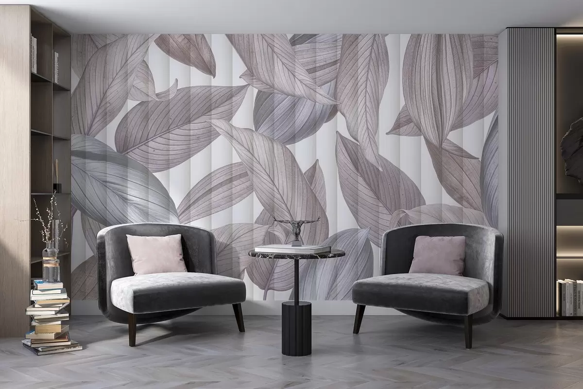 The addition of wall murals featuring abstract detailed leaves in shades of blue, gray, and pastel pink transforms the living room into a serene oasis. The soft, muted colors create a calm atmosphere, while the organic patterns of the leaves introduce a touch of nature indoors. This refreshing design enhances the light in the room, making it feel more spacious and airy. Complemented by elements of flora and fauna, the mural's elegant style harmonizes beautifully with the overall decor, inviting relaxation and creativity into the space.