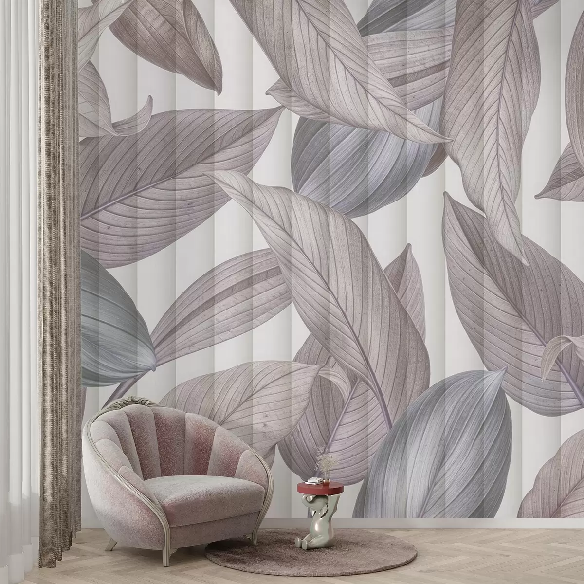 The addition of wall murals featuring abstract detailed leaves in shades of blue, gray, and pastel pink transforms the living room into a serene oasis. The soft, muted colors create a calm atmosphere, while the organic patterns of the leaves introduce a touch of nature indoors. This refreshing design enhances the light in the room, making it feel more spacious and airy. Complemented by elements of flora and fauna, the mural's elegant style harmonizes beautifully with the overall decor, inviting relaxation and creativity into the space.