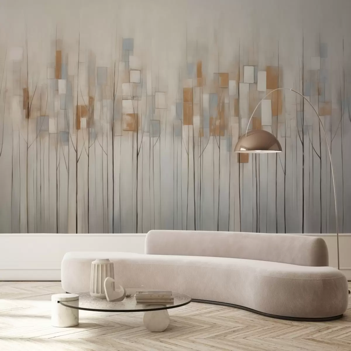 The addition of the Wall mural Abstract trees Nr. w08396 introduces a serene atmosphere to the living room. The subtle interplay of neutral light enhances the mural's calming colors, creating a harmonious backdrop. Wooden accents in the space echo the natural elements depicted, enriching the overall aesthetic. This mural transforms the room into a tranquil retreat, inviting relaxation and conversation while adding a touch of contemporary art that resonates with nature’s beauty. The uplifting design promotes a sense of well-being and connection to the outdoors.