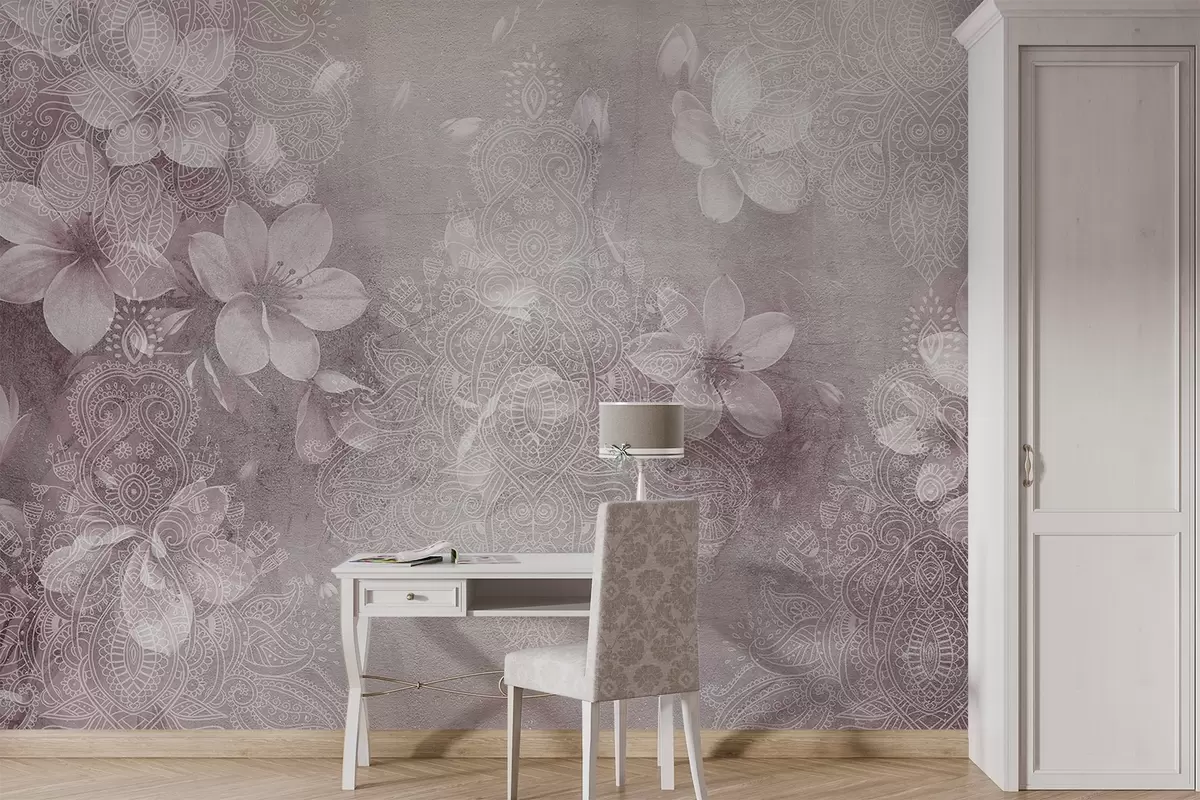 Wall murals Soft focus drawing of delicate white flowers on a blurred textured lace bordo background Nr. w08405v2