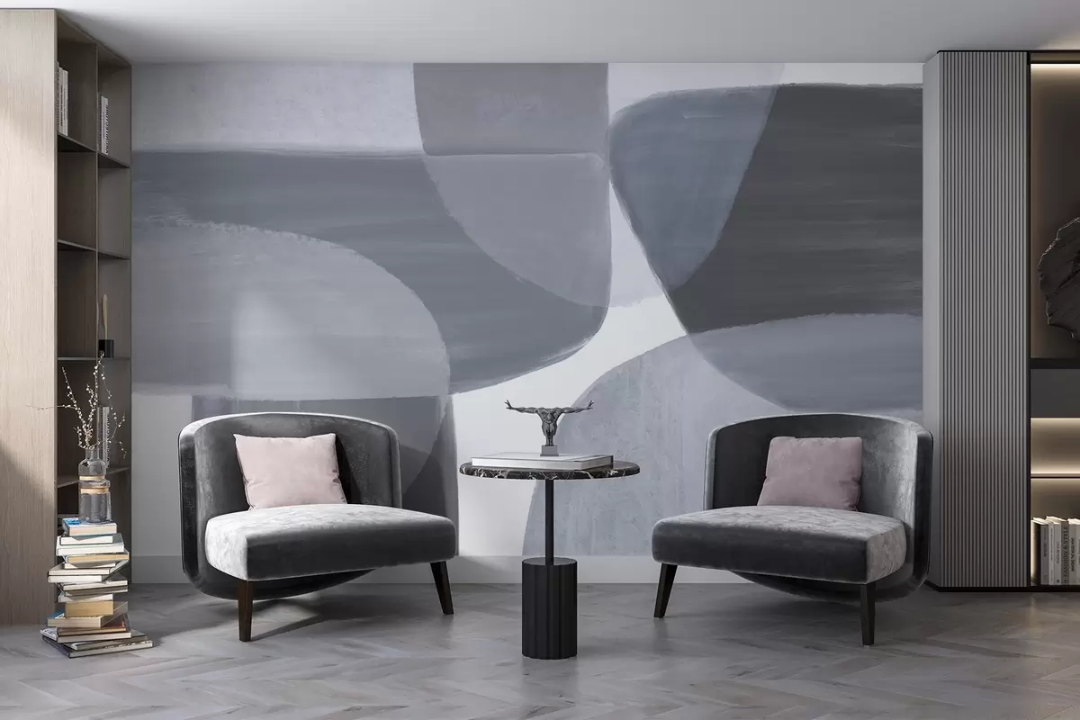 Wall murals A monochrome abstract print with overlapping minimalistic shapes and forms in shades of gray and blue Nr. w08410