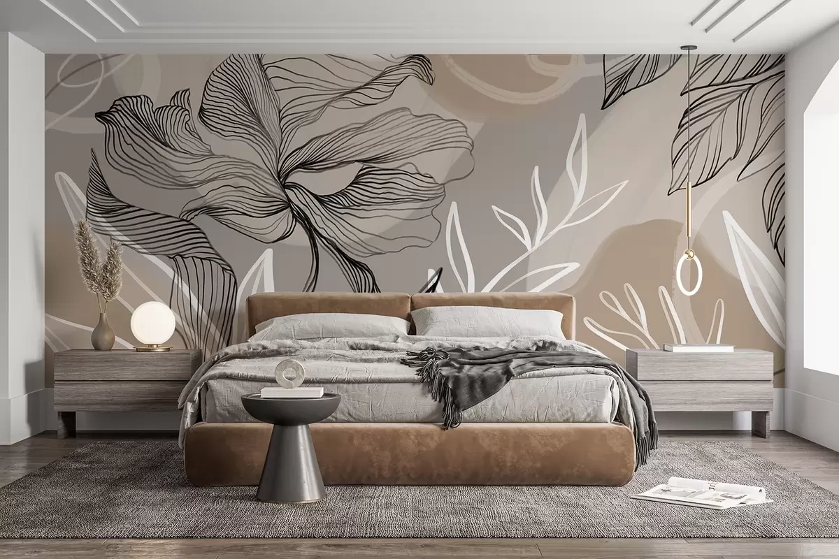 Wall murals Elegant floral print with large abstract line flowers and leaves in shades of gray and beige on a light background Nr. w08413