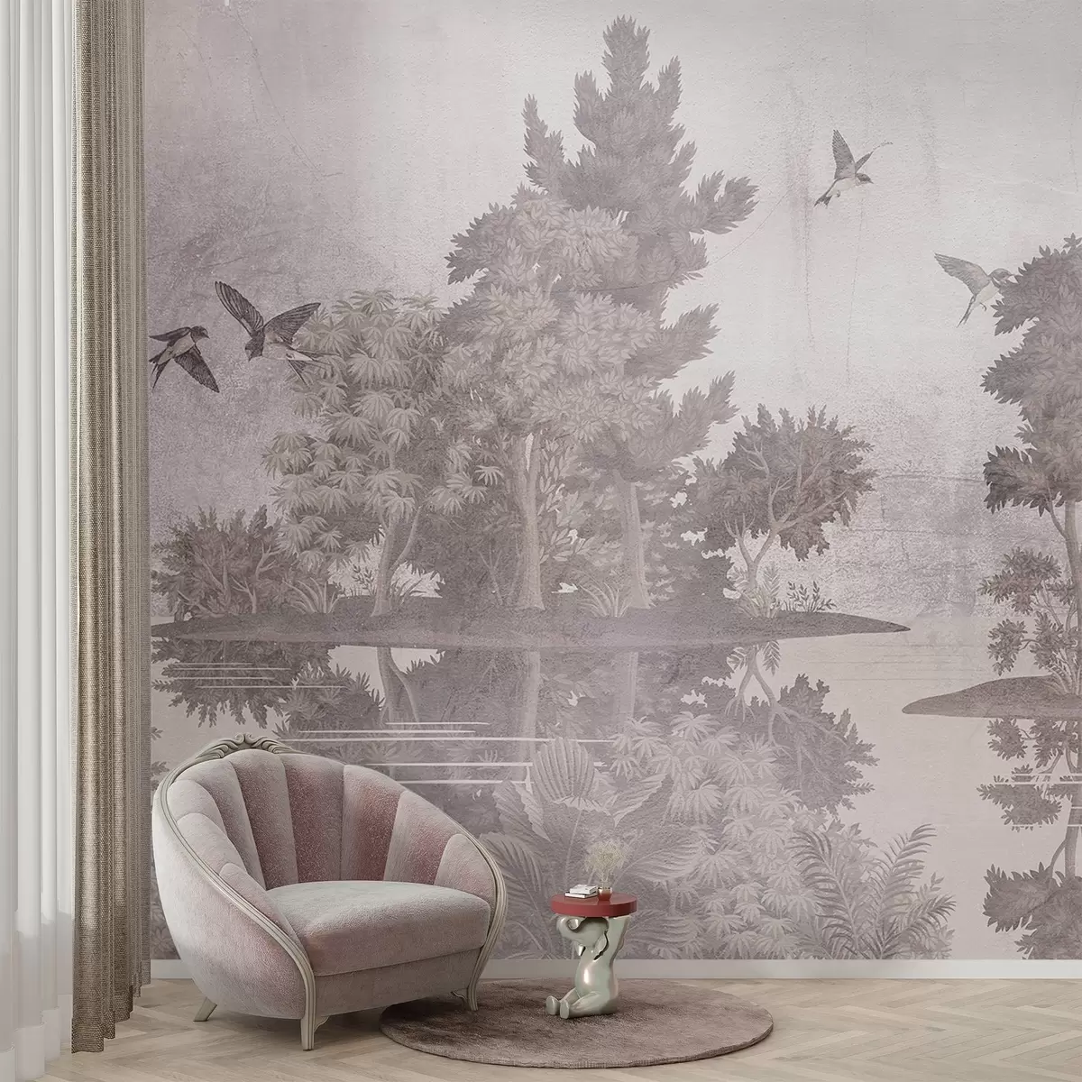 Wall murals A forest landscape print with a lake surrounded by pine trees and other foliage on a textural beige background Nr. w08426
