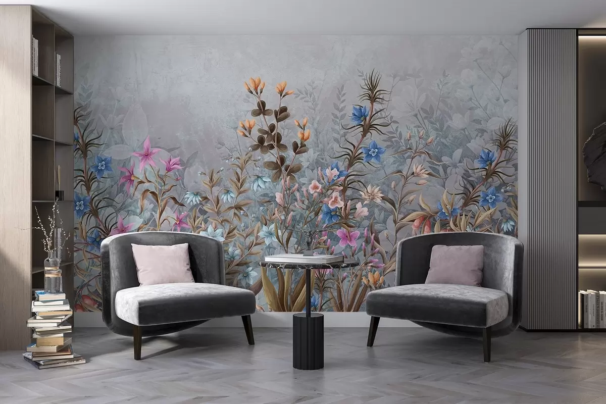 Wall murals A lush, vibrant floral textural print with colorful flowers and plants with intricate details and textures Nr. w08428